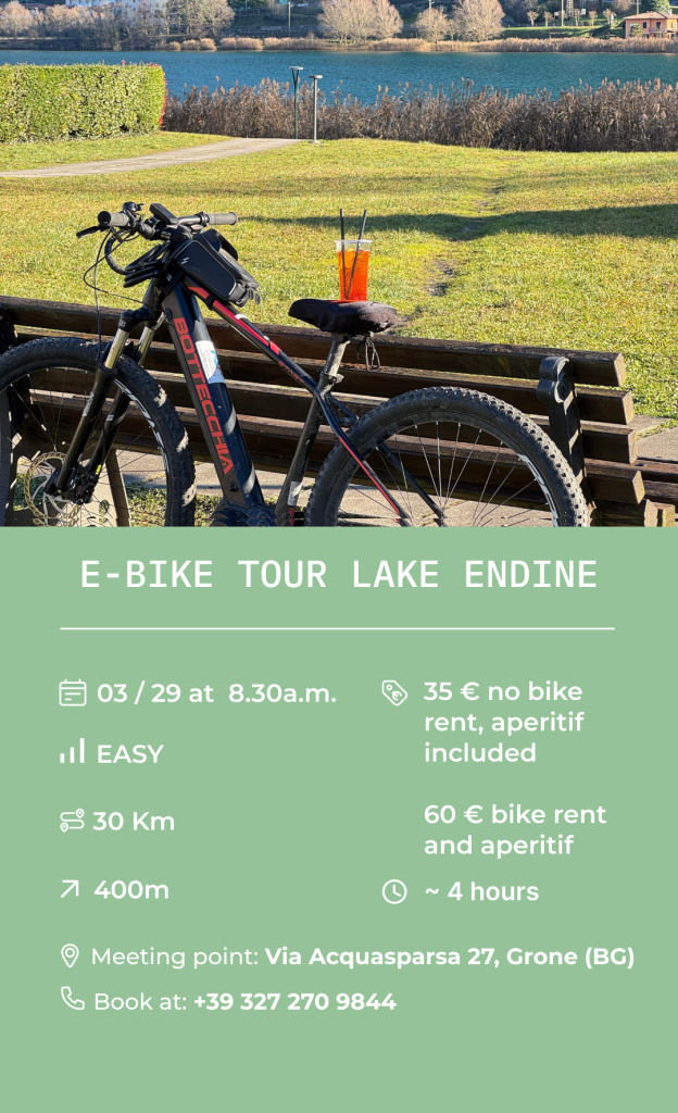 - 8:30 AM – Meeting point at the Spritz e-bike headquarters, Via Acquasparsa 27, Grone (BG), and e-bike handover.